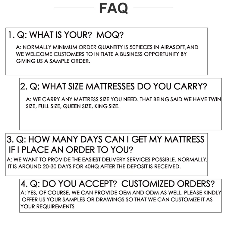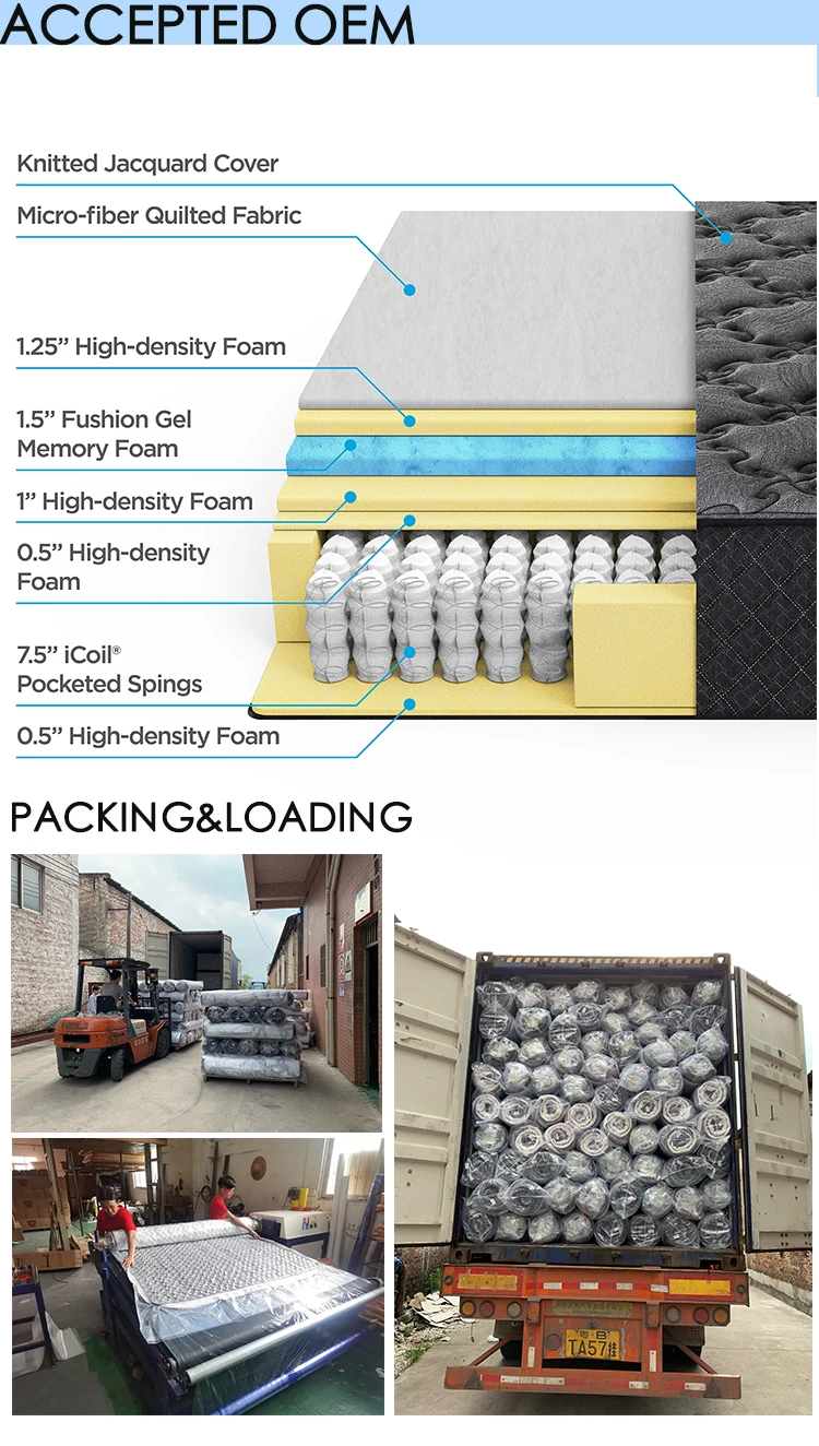 Configuration | Customize Structure & Send inquiry to get the newest market price 1/Top fabric :knitted fabric/ lint fabric / rayon fabric /3D fabric/brocade fabric /polyester fabric 2/Top quilting :polyester wadding/soft foam/memory foam/natural latex 3/Filler:natural latex/memory foam/soft foam/support foam/firm foam 4/Border fabric :knitted / lint / rayon /3D/brocade /polyester fabric+foam 5/two layer white cotton pad cover spring 6/Spring: continuous spring/bonnel spring/pocket spring/customize pocket spring 7/Bottom:knitted fabric/3D fabric/brocade fabric /polyester fabric+foam |