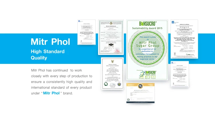 Mitr Phol sugar mill is the first mill in Thailand certified by ISO 9002: 1994 and it has been continuously recognized until today. Mitr Phol has been accredited with national and international standard.