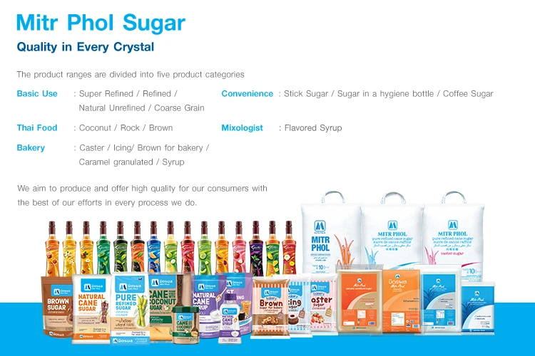 With a vision in sugar industry and strong commitment to offer the best products and experiences to the customers, Mitr Phol sugar offers an extensive range of sugar products to meet the different demand of our customers and the variety of sugar usage of both manufacturing customers and consumers. We are truly committed to R&D for continuous development of innovatively advance new products with international standards, hygienic and friendly to environment under the commitment of "Mitr Phol Sugar, Quality in Every Crystal"