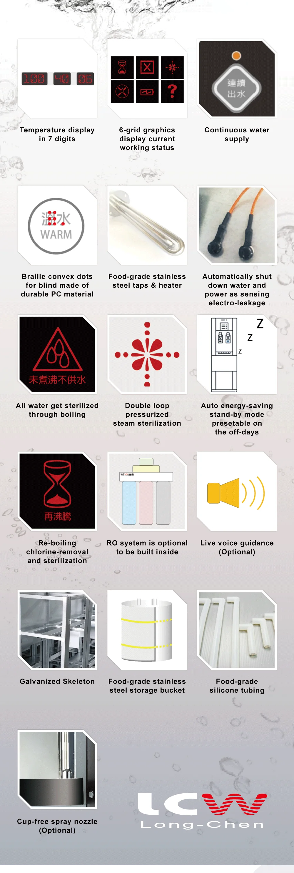 In addition to a large graphics display panel that can display functional images and temperature, Intelligent Energy-Saving Water Dispenser equip with hot water unlocking safety button, as well as an ECO DESIGN energy-saving technology system, making drinking water fashionable and safe.