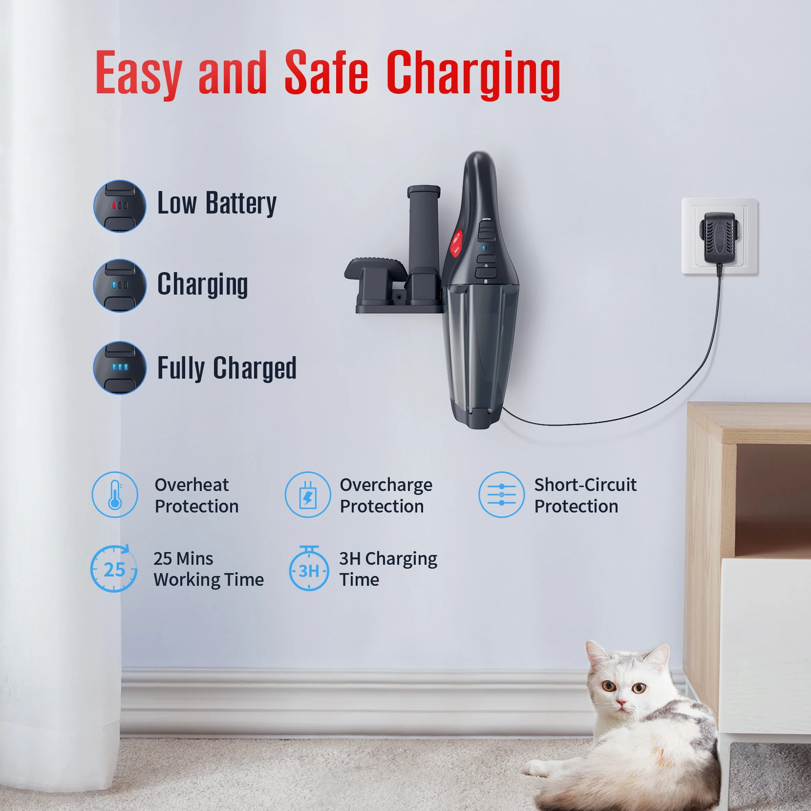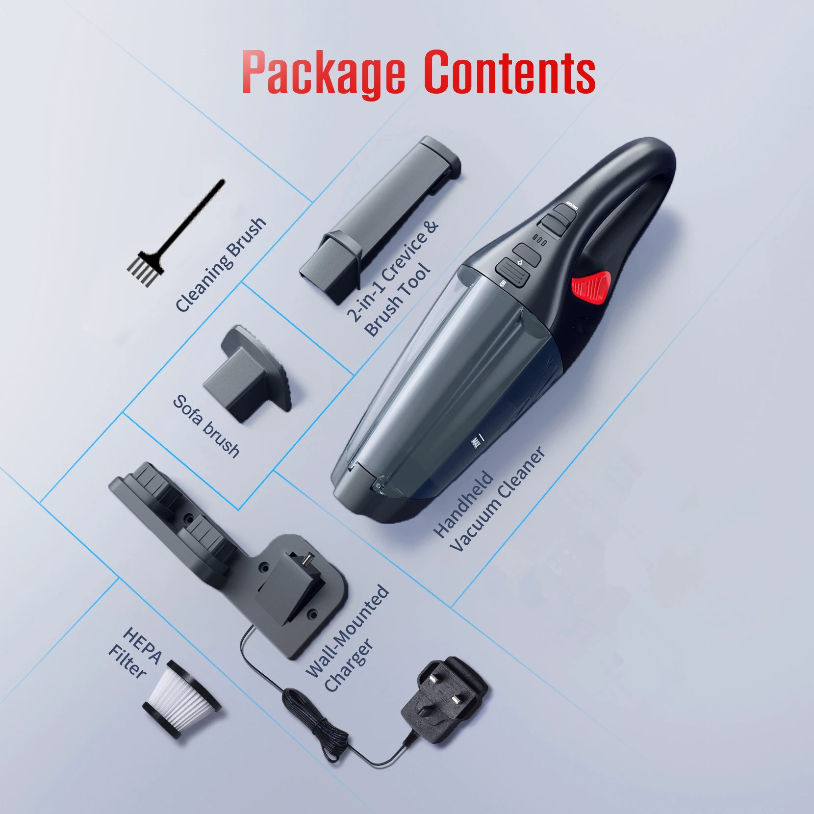 Function | Home appliance,clean home,able to use on hard floor, carpet, sofa, couches, curtains, chairs, and plenty of other surfaces at home and can vacuum dust, hair, paper, snack pieces, pet hair and some other life garbage. |