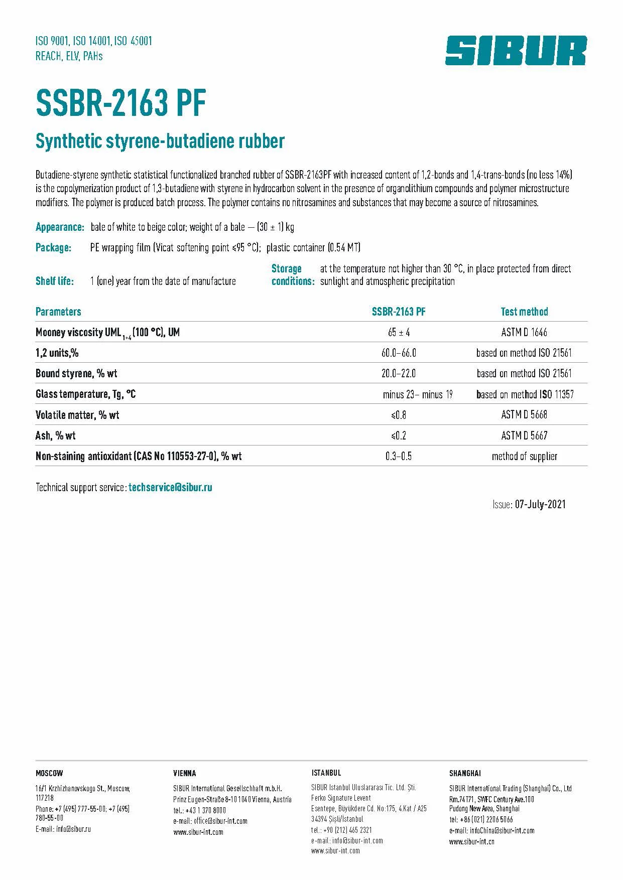 Butadiene-styrene synthetic statistical functionalized branched rubber of SSBR-2163PF with increased content of 1,2-bonds and 1,4-trans-bonds [no less 14%]. The polymer is produced batch process.