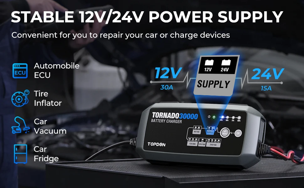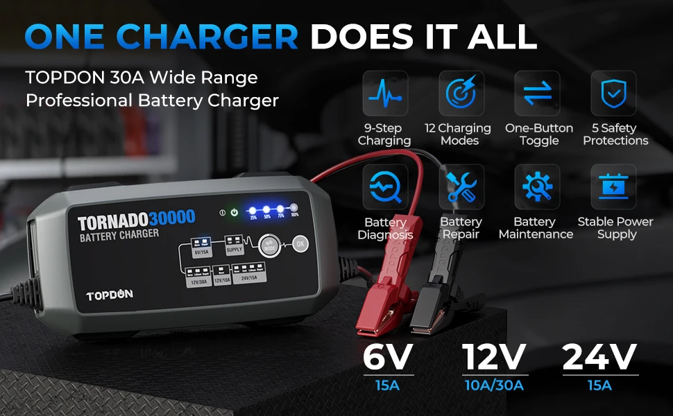 Charging Mode | 12V30A(NORM/LI/REP) 24V15A(NORM/COLD/LI/REP) 6V15A(NORM/REPAIR) SUPPLY 12V30A/24V15A 12V10A(NORM) | Type of Batteries | 6V/12V/24V |