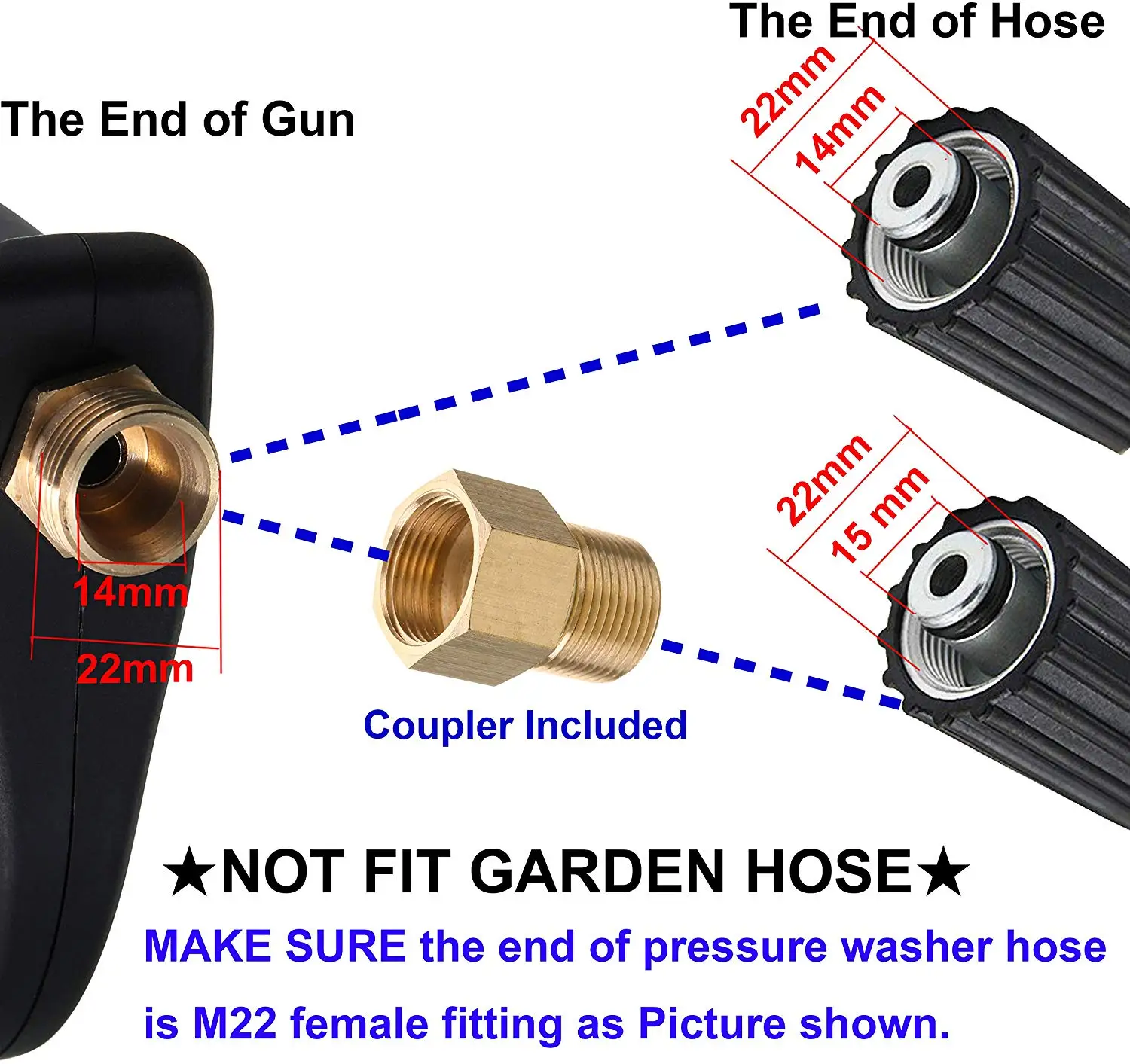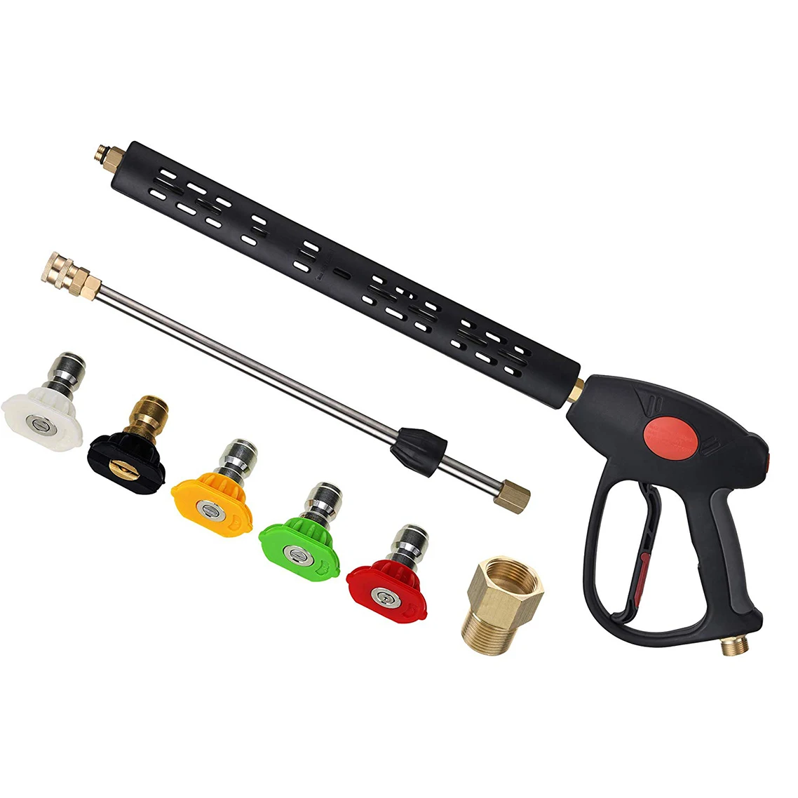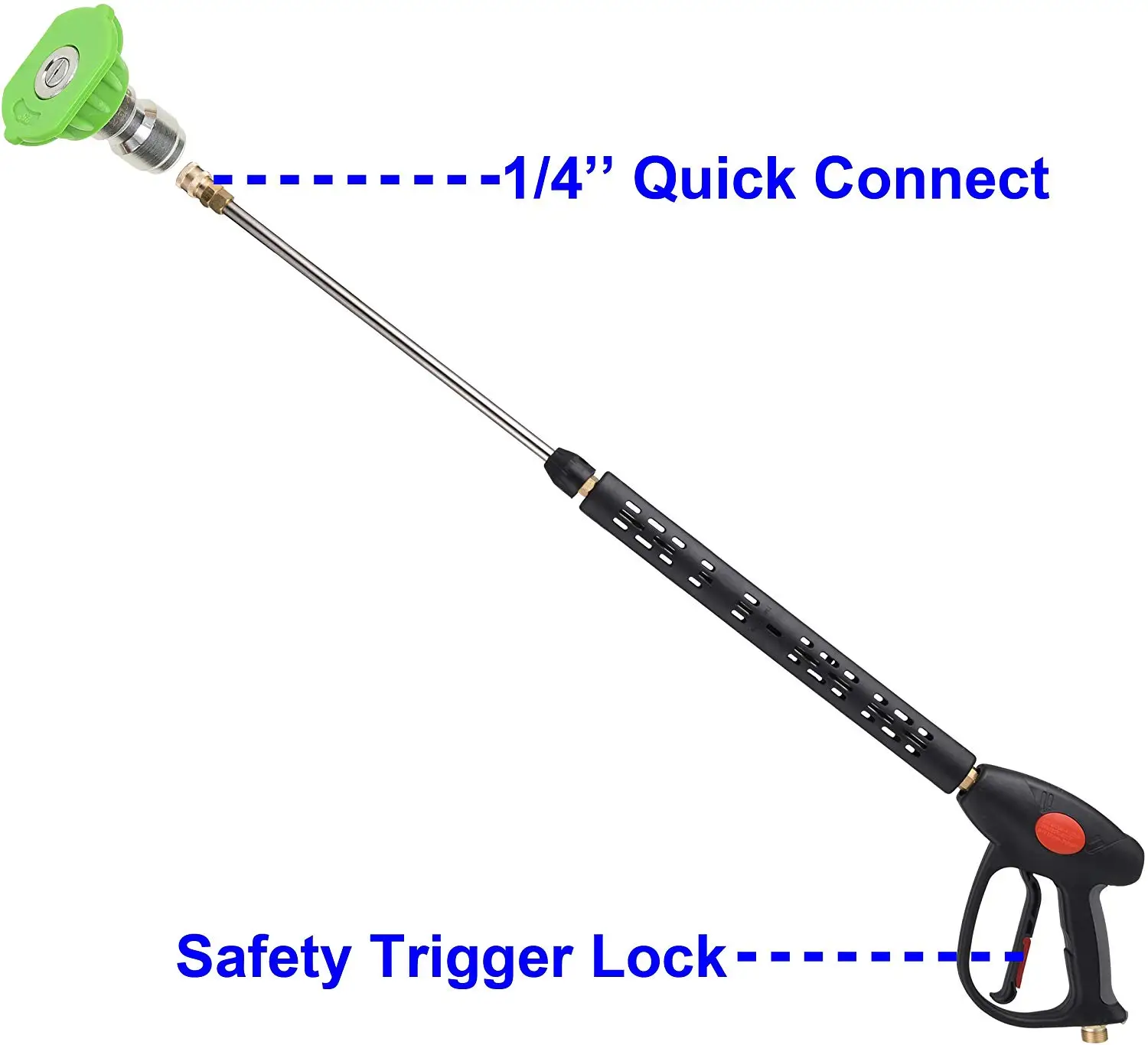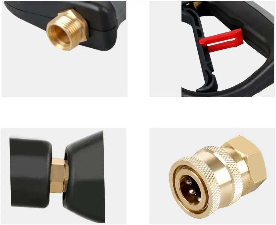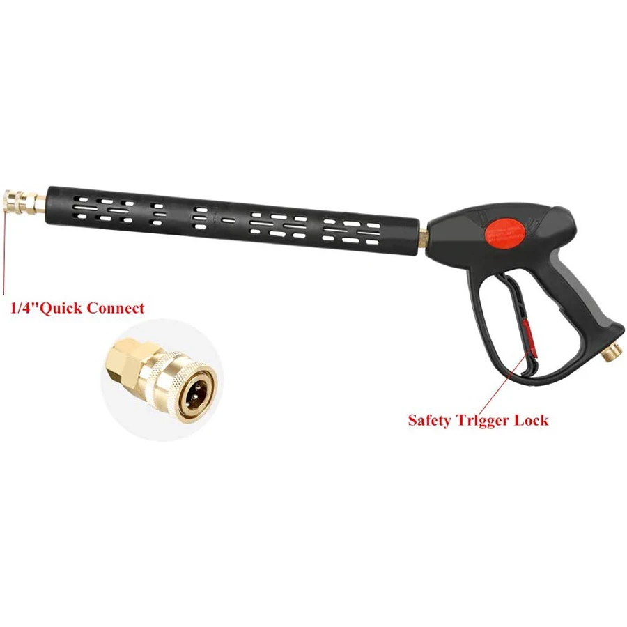 M22 14 мм или M22 15 мм фитинг. 1/4 ''быстрое отключение для насадок. M22 14 мм фитинг совместим с Generac, Simpson, Briggs Stratton, craftsman, karcher, Ryobi мойщик давления. M22 15 мм фитинг совместим с Sun Joe, Campbell, MI-T-M, AR Blue, Stanley, Cleanforce, Simoniz, Excell power washer. Регулируемая длина. 40 дюймов, 25 дюймов, 8,8 дюймов. Максимальное рабочее давление до 4000 PSI. Дизайн триггерного замка для избежания неправильной обработки. Удобная конструкция ручки для удобства эксплуатации.