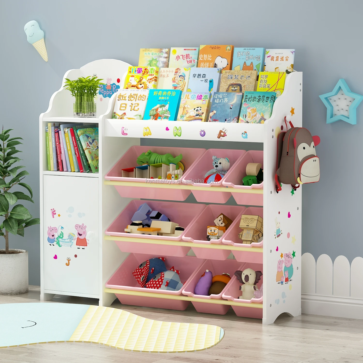 Best Selling Kids Wooden Storage Organizer Toy Children Storage Rack With Bookrack( Bins colors for your selection: 9 colors------green /red/ orange/ blue/ apricot/ gray/ cyan/ white/ pink)