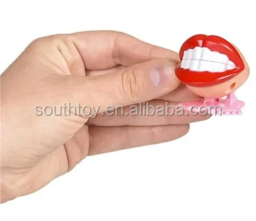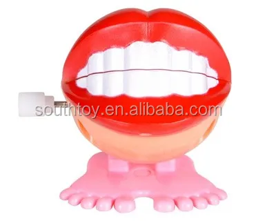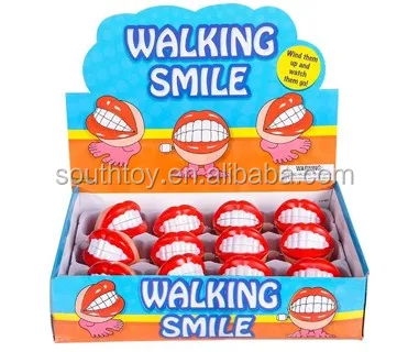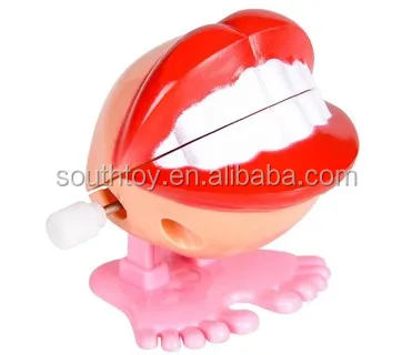 Wind up this smiley set of choppers before placing on flat surface. The feet will begin to move at a frenetic pace, hopping and bopping all over the place. This is packed in opp bag per pc, also can be display box. For ages 5+.