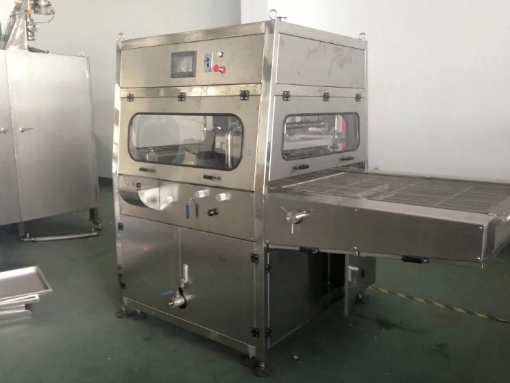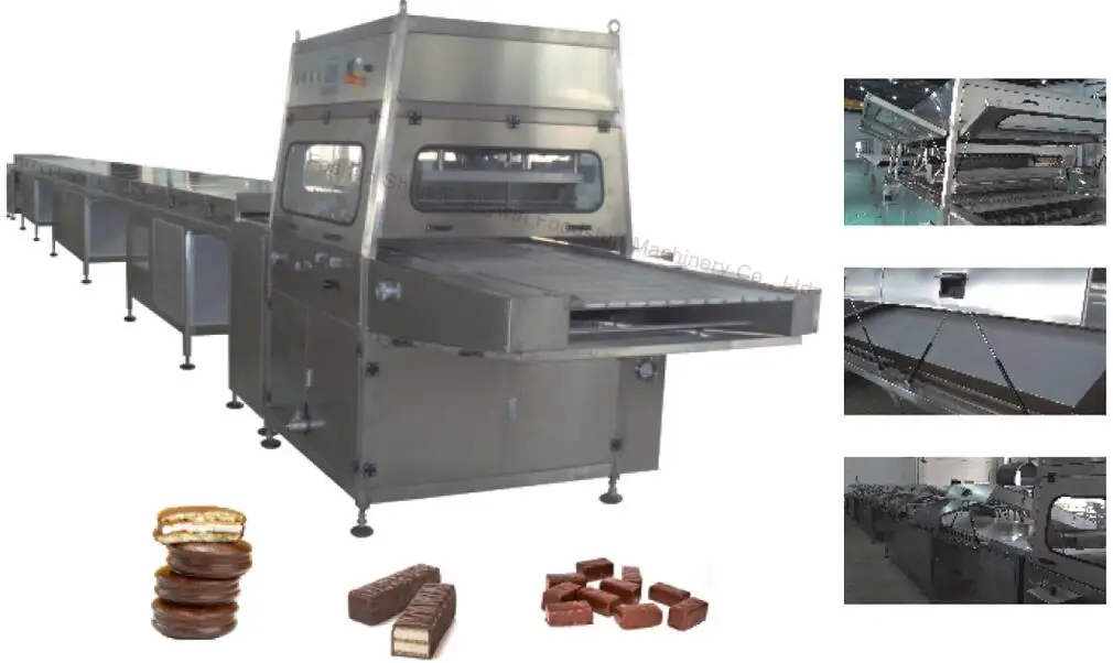 This machine has functions of whole coating, single-sided coating, partial coating and cooling. It can coat chocolate on many kinds of food, such as pastry, pie, biscuit, wafer, candy and etc. to form chocolates with various unique flavors.