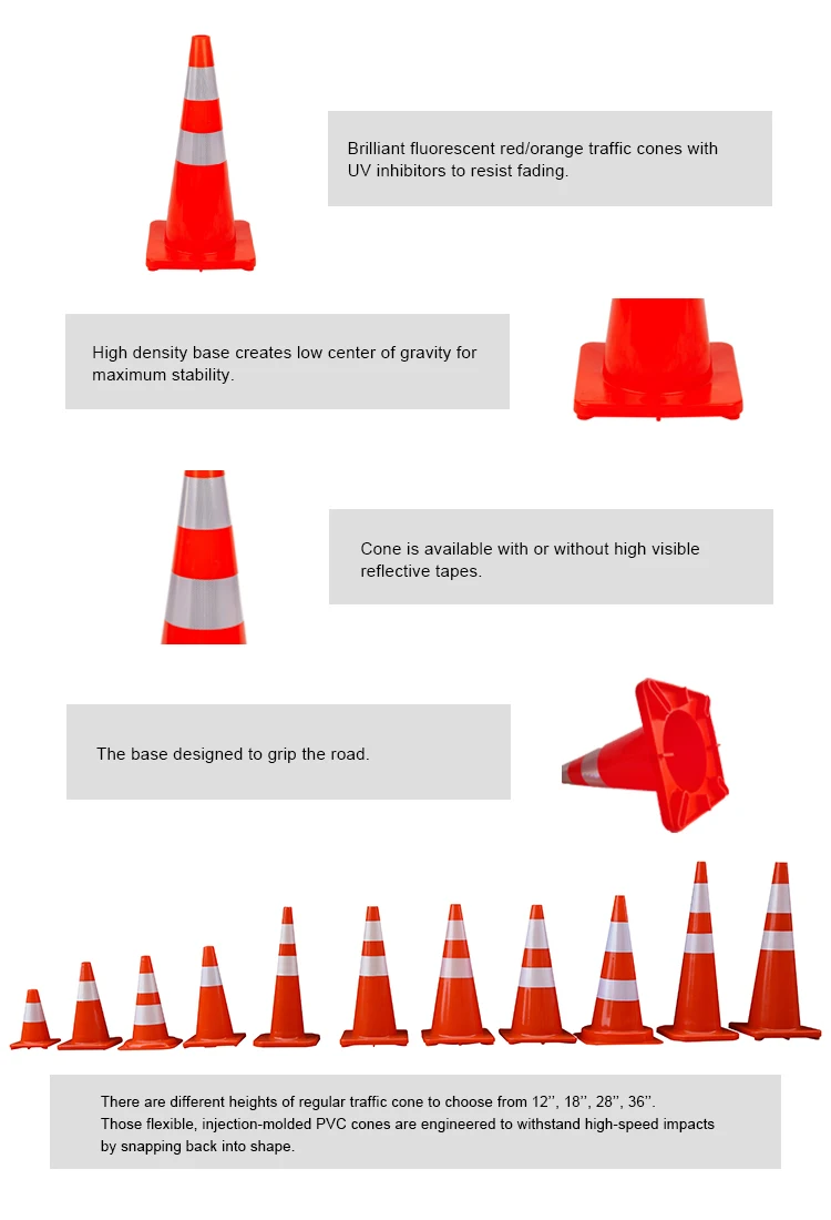 Product Description | 1.Traffic cones, also called road cones, highway cones, safety cones or construction cones. 2.They are usually cone-shaped markers that are placed on roads or footpaths to temporarily redirect traffic in a safe manner. 3.They are often used to create separation or merge lanes during road construction projects or automobile accidents, although heavier, more permanent markers or signs are used if the diversion is to stay in place for along period of time. |