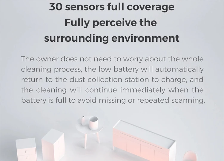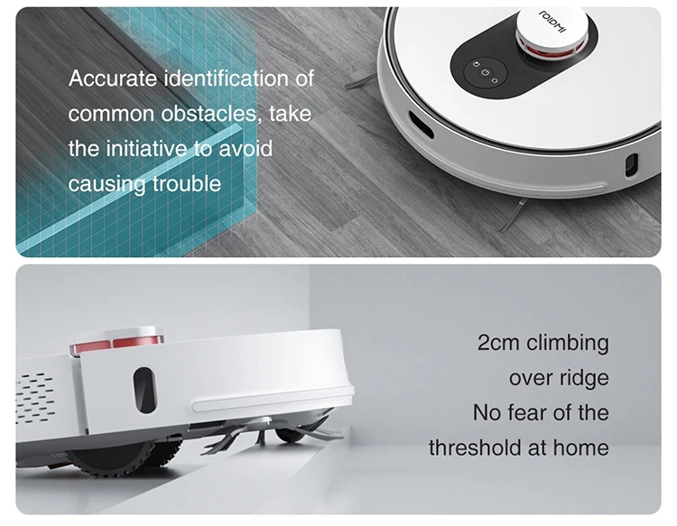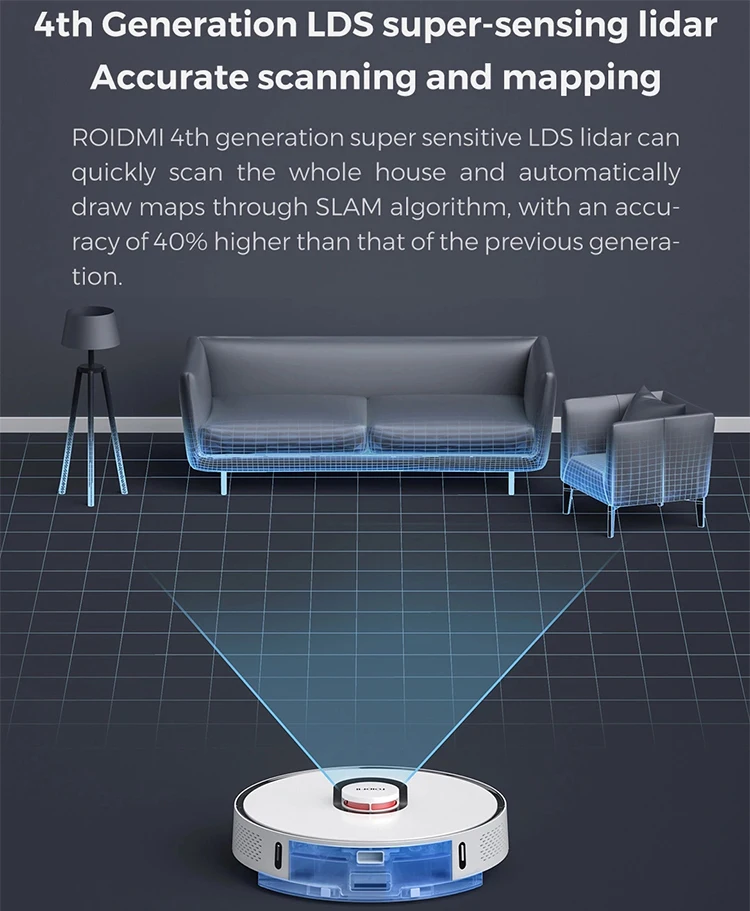 ROIDMI 4th generation super-sensitive LDS lidar can quickly scan the whole house and autamatically draw maps through SLAM algorithm,with an accuracy of 40% higher than that of the previous generation.