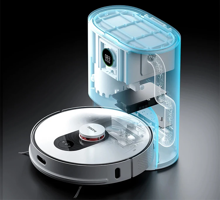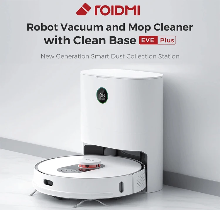 ROIDMI EVE Plus is not only a charging station,but also an iontelligent garbage can. After cleaning,it will auto-matically empty the dust box and automatically pack the dust when the dust is full. It also has the original ozone antibacterial and deodorzing technology and meanwhile it can realize eliminate dirty hands and smelling trash.
