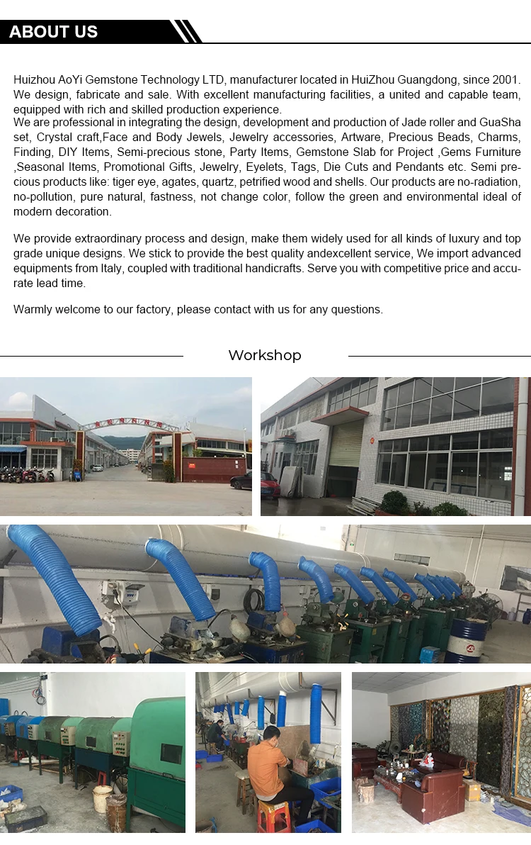 We are professional in integrating the design, development and production of Jade roller and GuaSha set, Crystal craft,Face and Body Jewels, Jewelry accessories, Artware, Precious Beads, Charms, Finding, DIY Items, Semi-precious stone, Party Items, Gemstone Slab for Project ,Gems Furniture ,Seasonal Items, Promotional Gifts, Jewelry, Eyelets, Tags, Die Cuts and Pendants etc. Semi precious products like: tiger eye, agates, quartz, petrified wood and shells. Our products are no-radiation, no-pollution, pure natural, fastness, not change color, follow the green and environmental ideal of modern decoration.