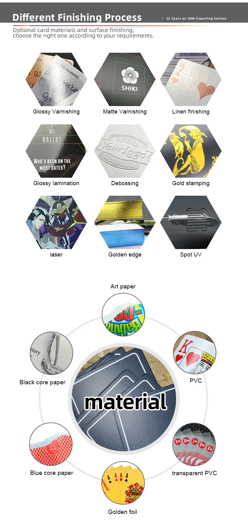 Surface: | Cards: spot UV/spot gold or silver foil/Glossy lamination or matt finish. Box: spot UV/spot gold or silver foil/Glossy lamination . |