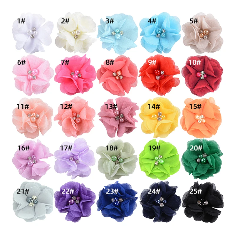 Product Name | 25 colors Hand sewn pearl Rhinestone clothing accessories chiffon flowers | ||||||