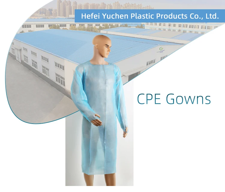 Plastic Waterproof Disposable medical CPE Gown/ CPE Isolation Apron / Protective Gown with Thumb Hook