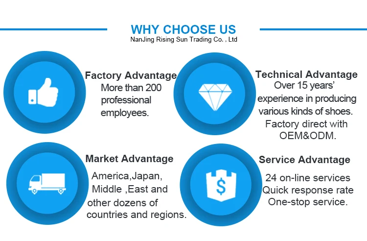 NanJing Rising Sun Trading Co.,Ltd is located in Jiangsu Province,spe- cialized in manufacturing and trading various of footwear,main products are PVC shoes,rubber shoes, military boots, outdoor hiking shoes and safety shoes. We have professional designs, a development and production team, we could provide private design according to customers special requirements. We exported the mentioned products to many countries, such as Japan,European, Middle East and USA. Because of high quality products and good services, we set long-term relationships with many famous buyers such as Disney, Nishimatsu, Tommy Hilfiger, Walmart etc. We have two son factories that cover an area of 40000 square meters, with more than 200 professional workers. We warmly welcome you to contact us,we will guarantee high quality with the most competitive prices.