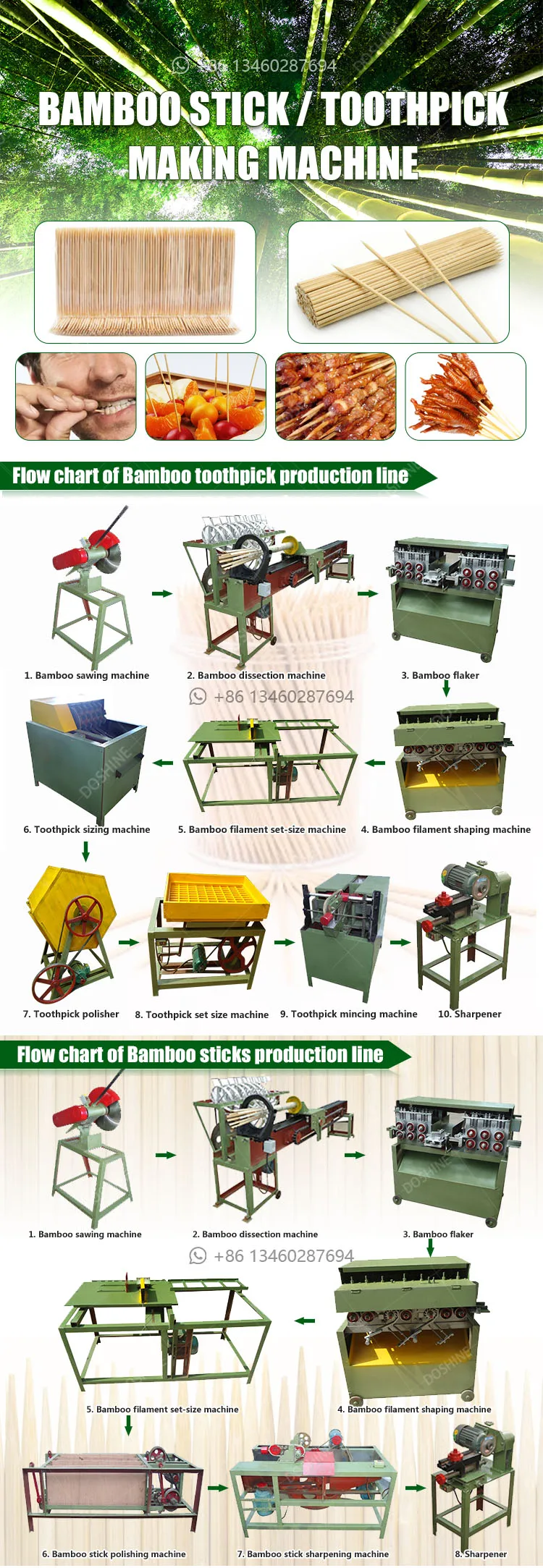 3. Usually, every 100 kg of fresh (wet) moso bamboo can produce 100,000 to 130,000 toothpicks with a diameter of 2.0 mm and a length of 65 mm, and about 13-16 kg of dry finished toothpicks. |