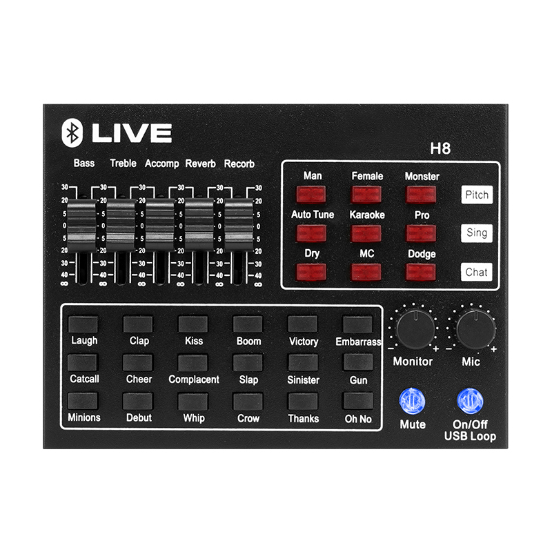 18 atmosphere special effects buttons, namely: Oh, Surprise, Reminder, Beat, Complacent, Kiss, It's too difficult, Reverse, Thank you, Despise, Cheer, Bad Laughing, Clap, Doubt, Bad Smile, Crow, What, Laugh3. The anchor can choose the special effect atmosphere needed according to the live broadcast scene.
