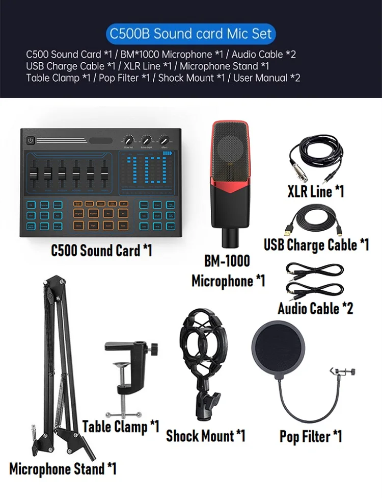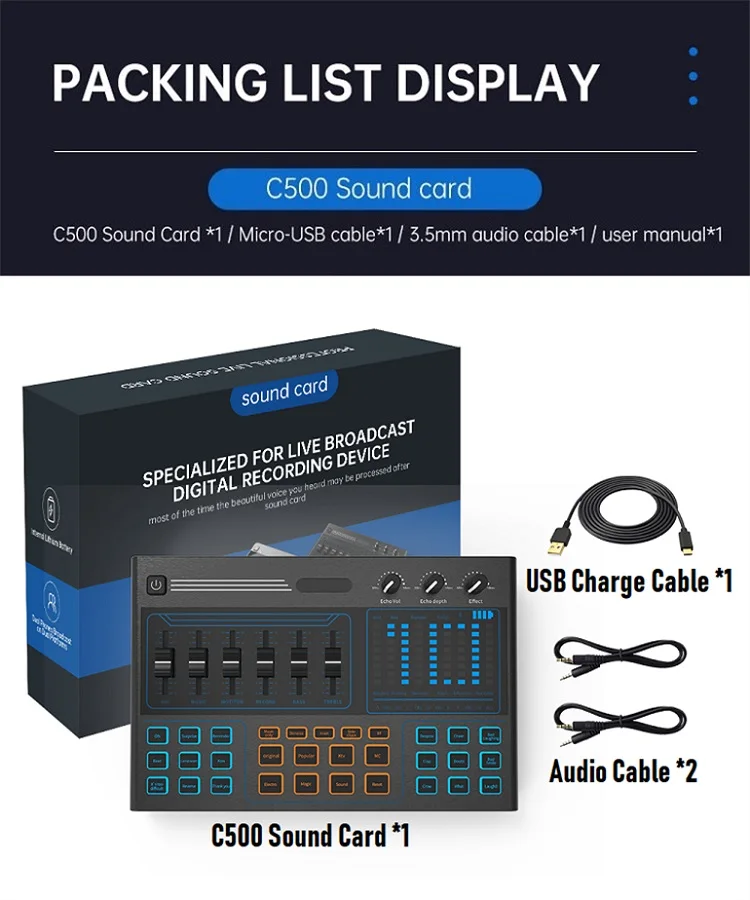 Shiya C500 sound card is a comprehensive audio processing solution that integrates audio collection, processing, and output control. It is compatible with smartphones, tablets and computers, including Android, iOS, Window and macOS. It is plug and play and requires no additional drivers. The built-in DSP digital audio processor allows you to change your voice with a button and add more sound effects to your podcast, which will make your live broadcast more entertaining.