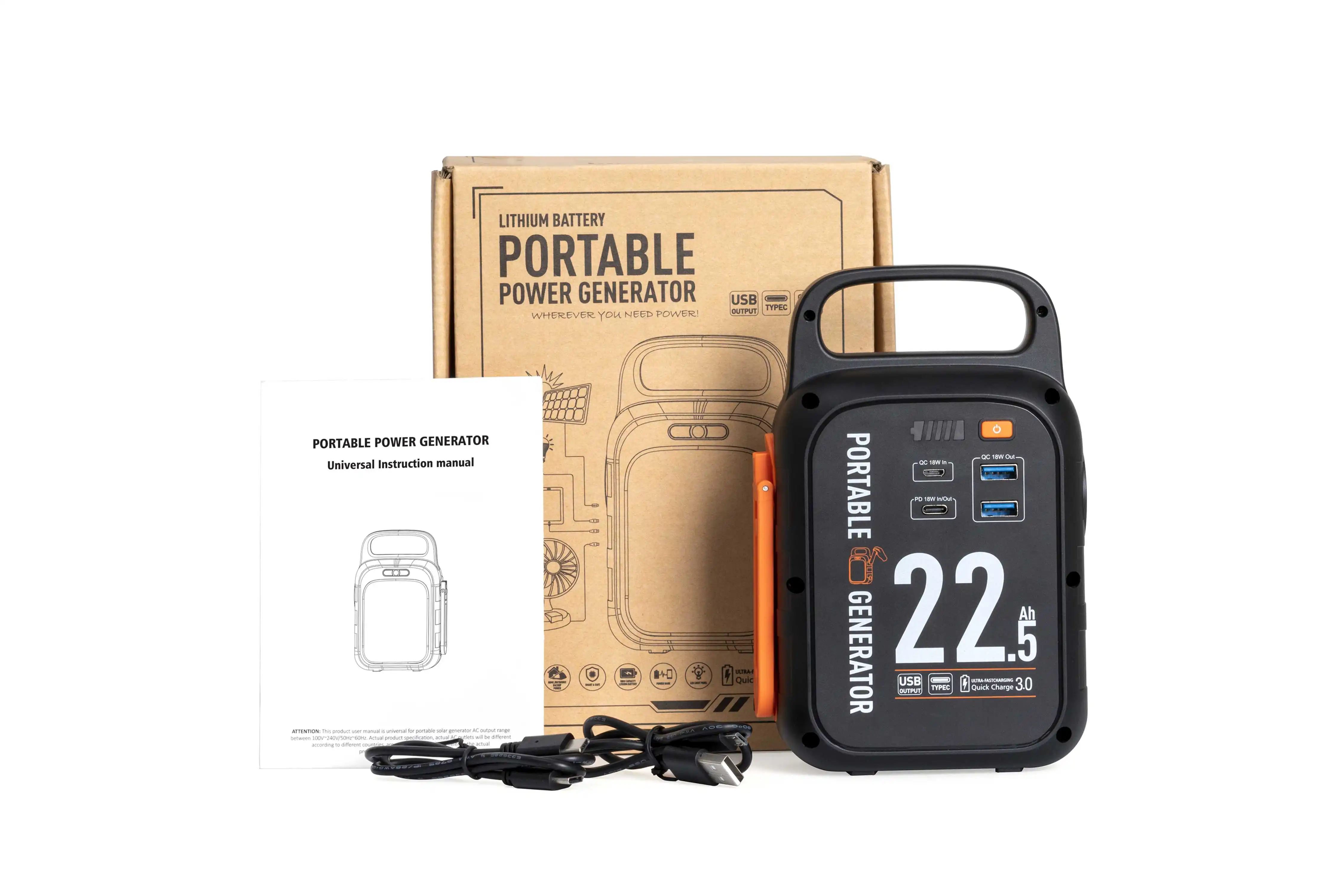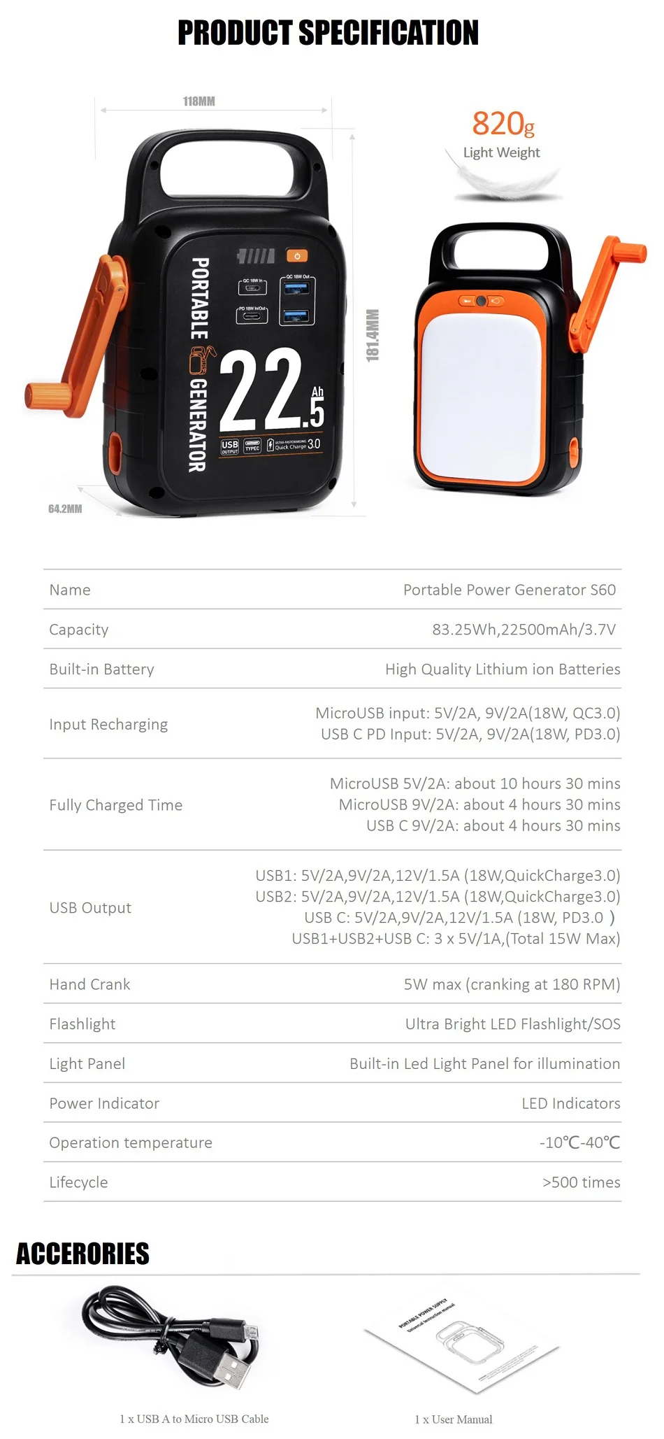 Package include: | 1 x Portable Power Generator 1 x 50cm USB A to Micro USB Cable 1 x User Manual |