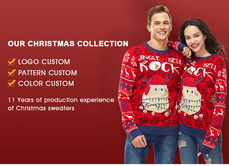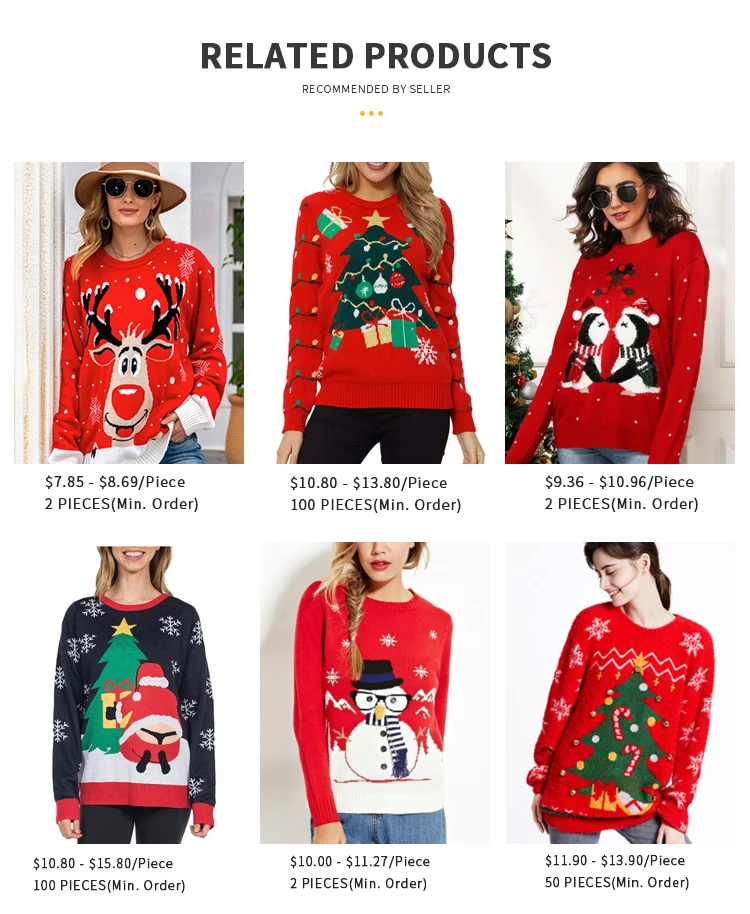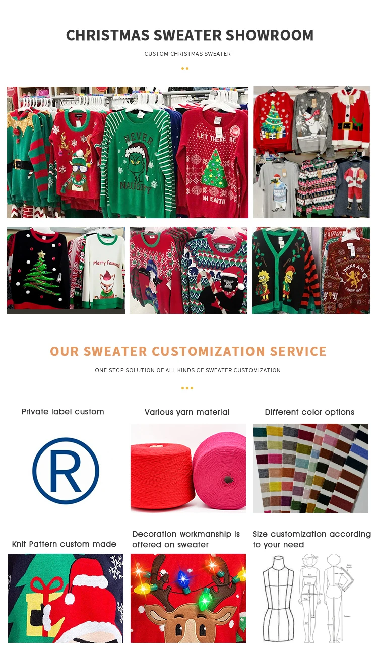 Customization service | Christmas sweater material can be custom made to others like: 100% Acrylic, 100% Cotton, Cotton nylon, Cotton viscose, Wool acrylic, Merino Wool, Cashmere, Alpaca, Mohair, Recycle material and so on. |