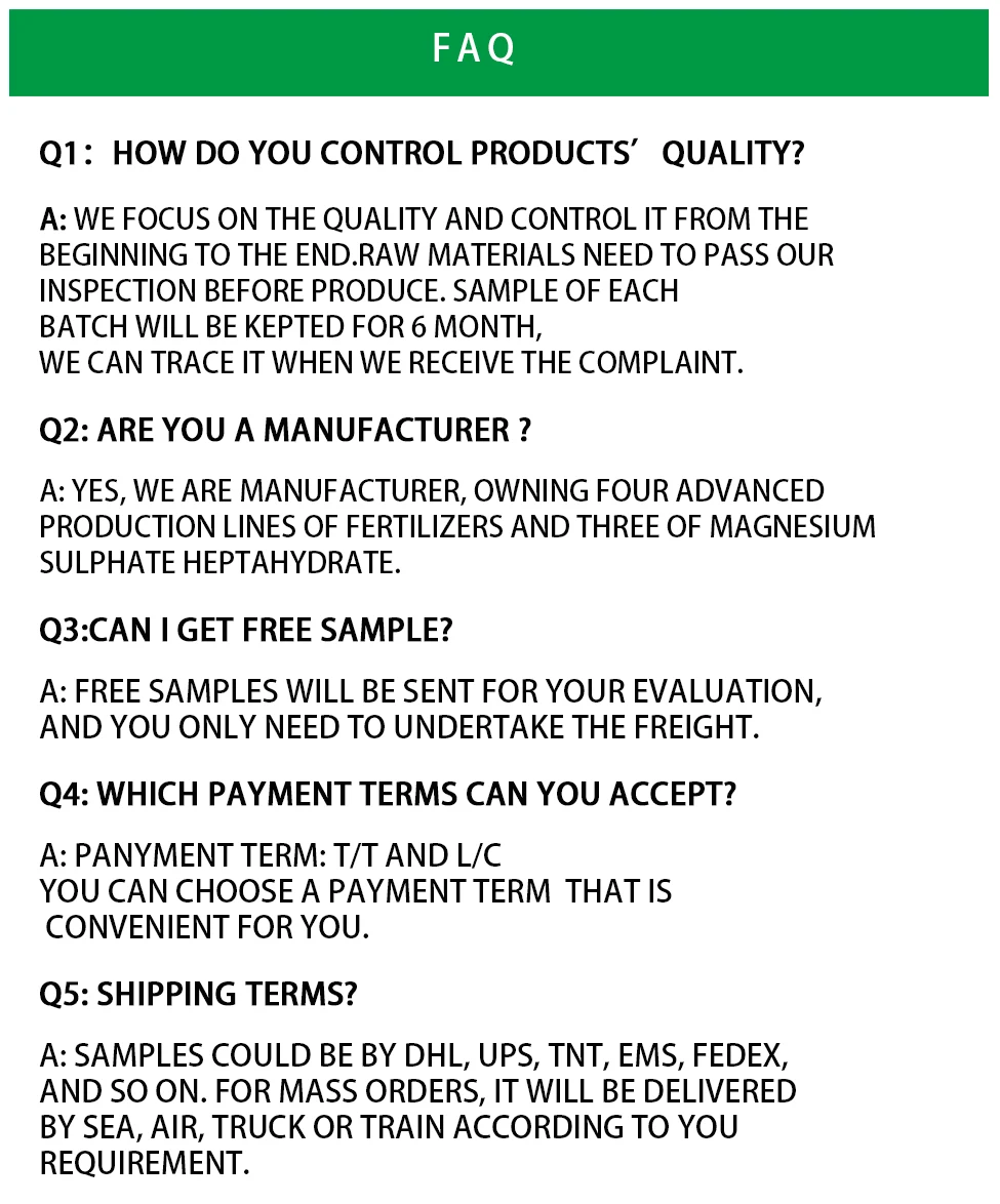 Hebei Harmon, as one of the professional chemical companys in China, owns 3 advanced production lines of Magnesium sulphate heptahydrate and 4 advanced production lines of fertilizers and in another workshop, which located in Hebei and Shandong province in China. The total area is more than 70000 square meters. Relying on the state of art production equipment, effective quality control measuring instruments, well-trained personnel and advanced information technology, our products are selling well in the international market with good quality and reasonable price.Specifically, the products are complying with the industrial and national standards.
