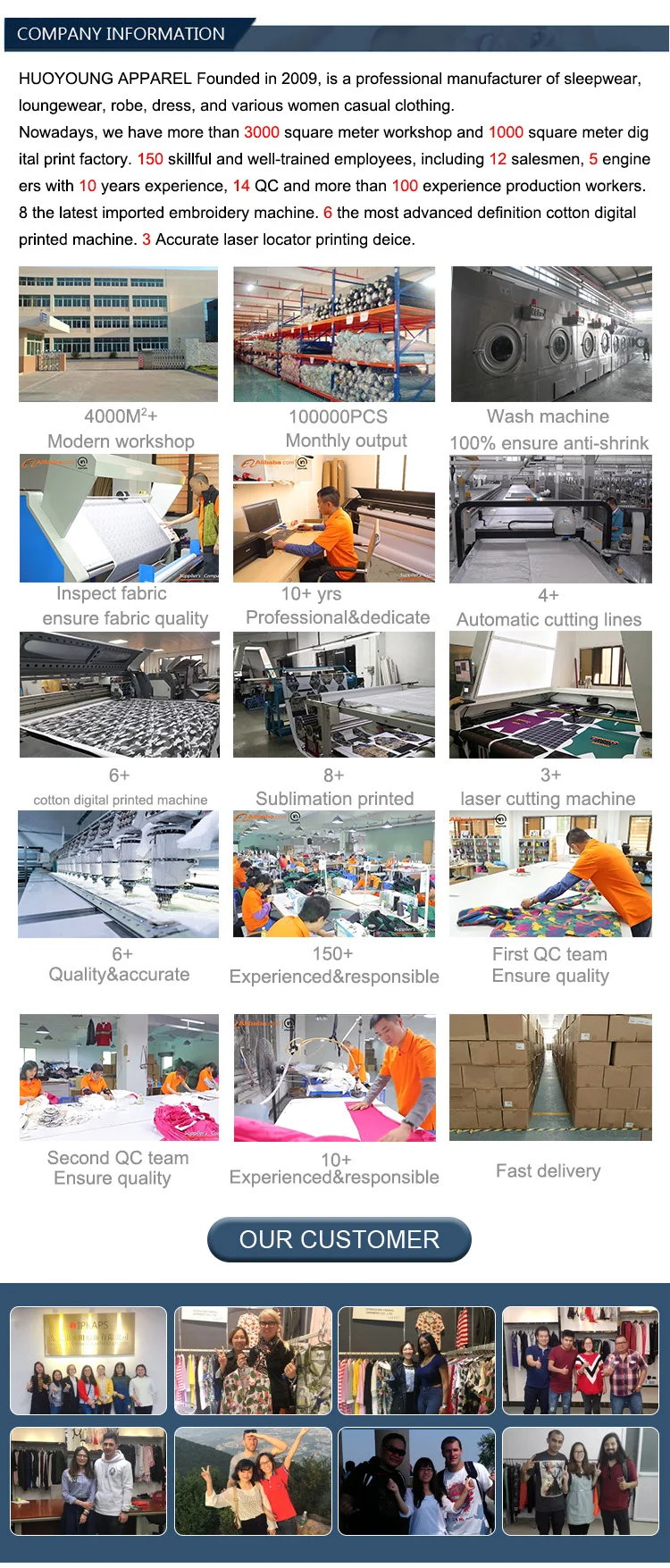 About our company | We have our own large scale workshop, enthusiatic sales team, high efficient sample making team, display room, the latest and most advanced imported embroidery machine and printing machine. | ||||||