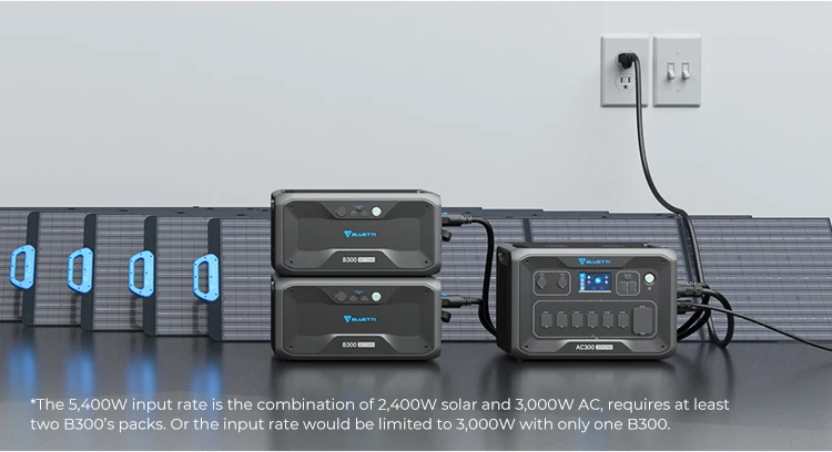 Solar +D050S Module connect with AC charging port | / | AC+SOLAR INPUT 700W | Solar + AC 5400W max (when connected with 2 B300) | |||||