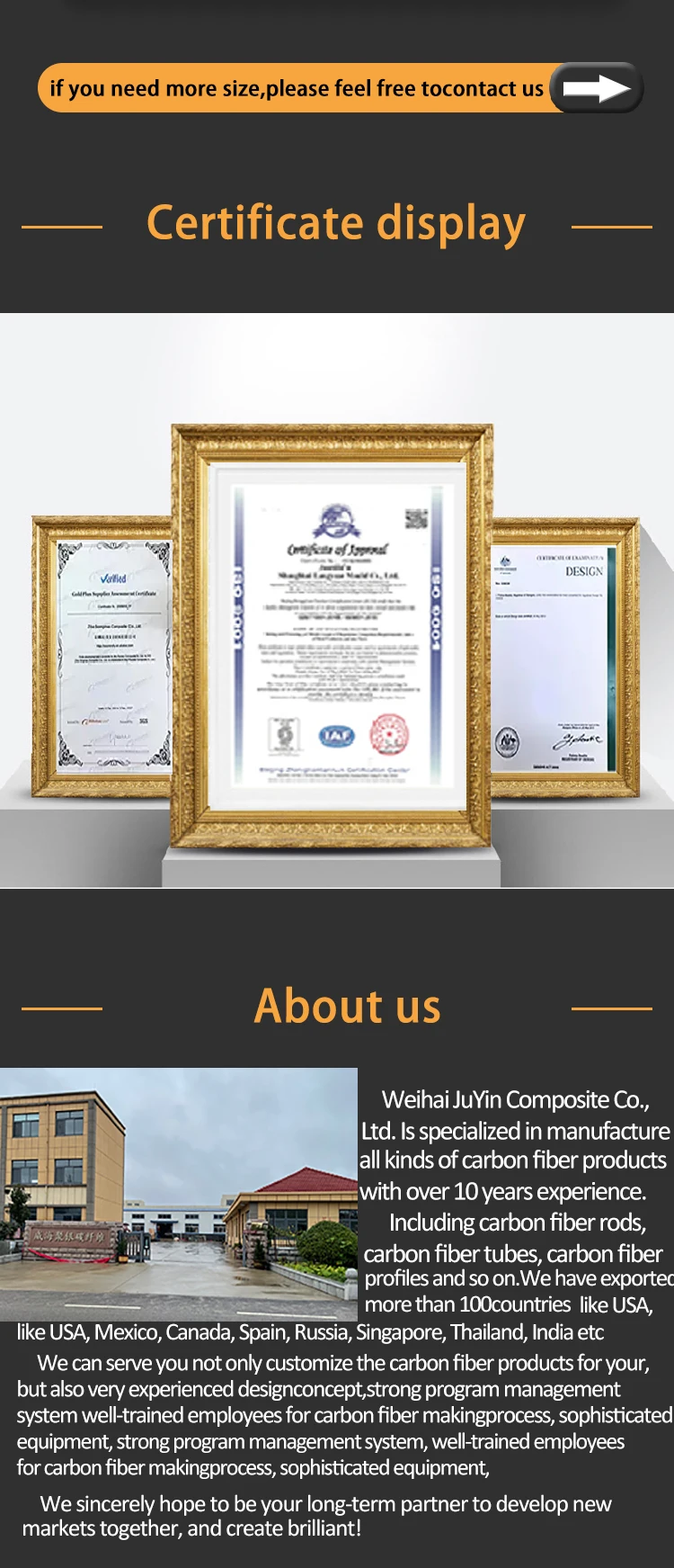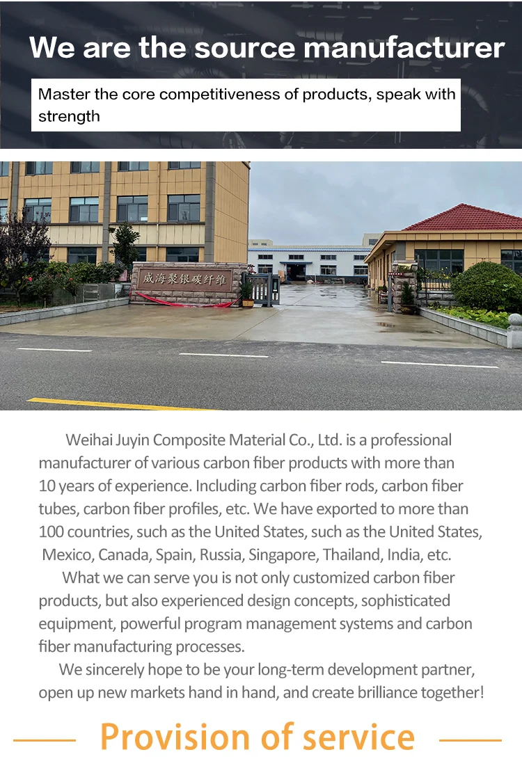 Weihai JuYin Composite Co., Ltd. Is specialized in manufacture all kinds of carbon fiber products with over 10 years experience. Including carbon fiber rods, carbon fiber tubes, carbon fiber profiles and so on.