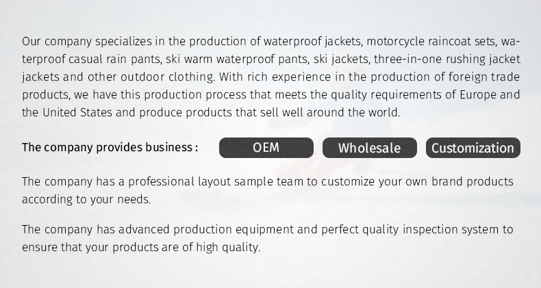 4. Why buy from us instead of other suppliers? We are Shengzhou Tianwang Rainwear Co., Ltd, a professional raincoat OEM and ODM designer and manufacturer. We produce many kinds of multi-functional rainwear, including workwear, waterproof jacket, waterproof rain pants and outdoor leisure raincoat.