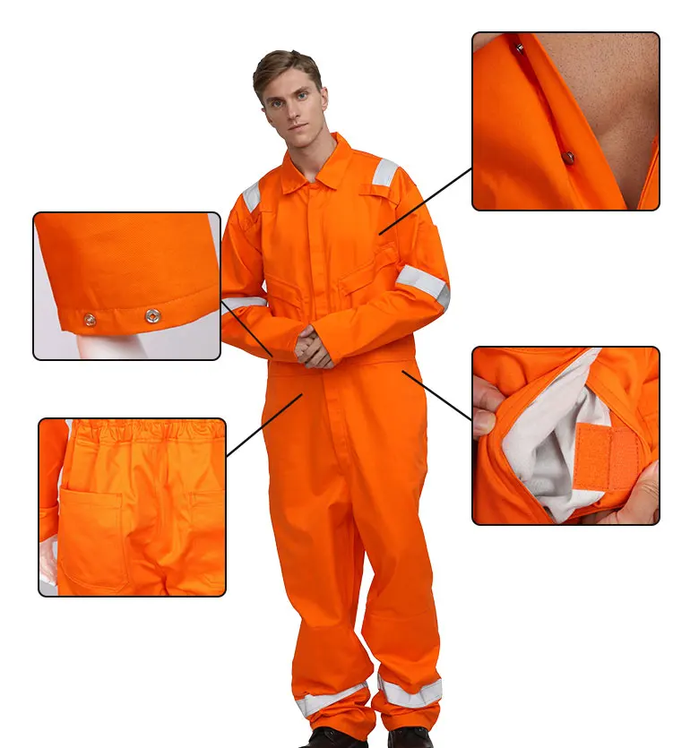 2、50mm offshore FR reflective tape on shoulder & sleeves & legs 3、2 chest pockets with flap & 1 leg pocket with flap 4、2 chest pocket with flap & 2 hand pockets 5、Back pleat 6、Adjustable cuffs