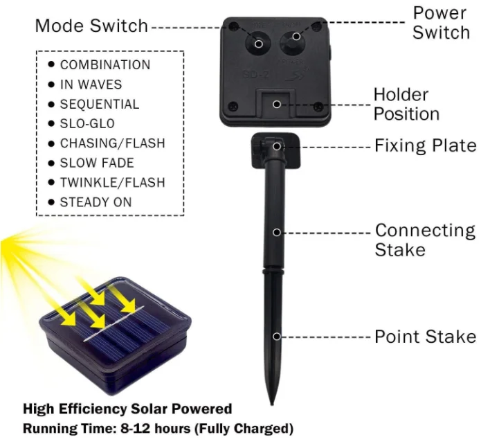 8 modes | Waves, Combination, Fading, Fireflies, Chasing, Twinkle, Fading slowly, and Steady-on. |