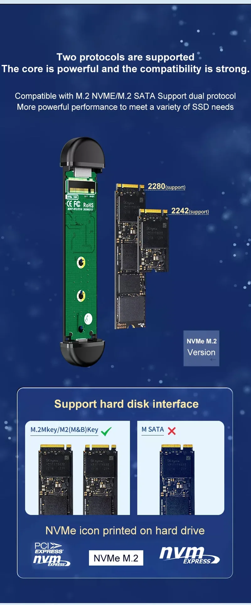 NVME supports M.2 NVME M KEY&B+M KEY (PCIE protocol) SSD, supports M.2 NGFF B+M KEY (SATA protocol) SSD, SSD length: 2242/2260/2280