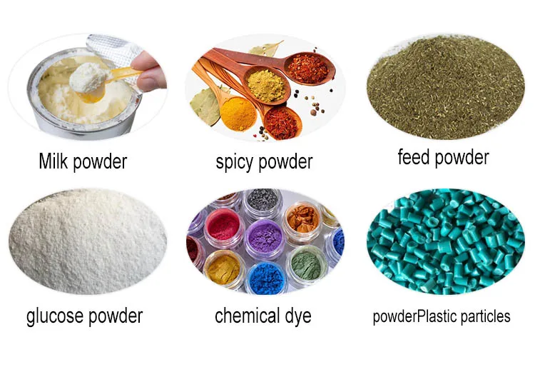 This machine mainly applies to food, daily chemical, seasoning, pesticides and other industries.Such as milk power, corn powder, soybean milk powder, herbs, cereals, condiments, spices, food additives, washing power, salt, chilli power, coffee, milk tea, flour and etc.