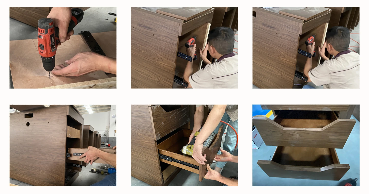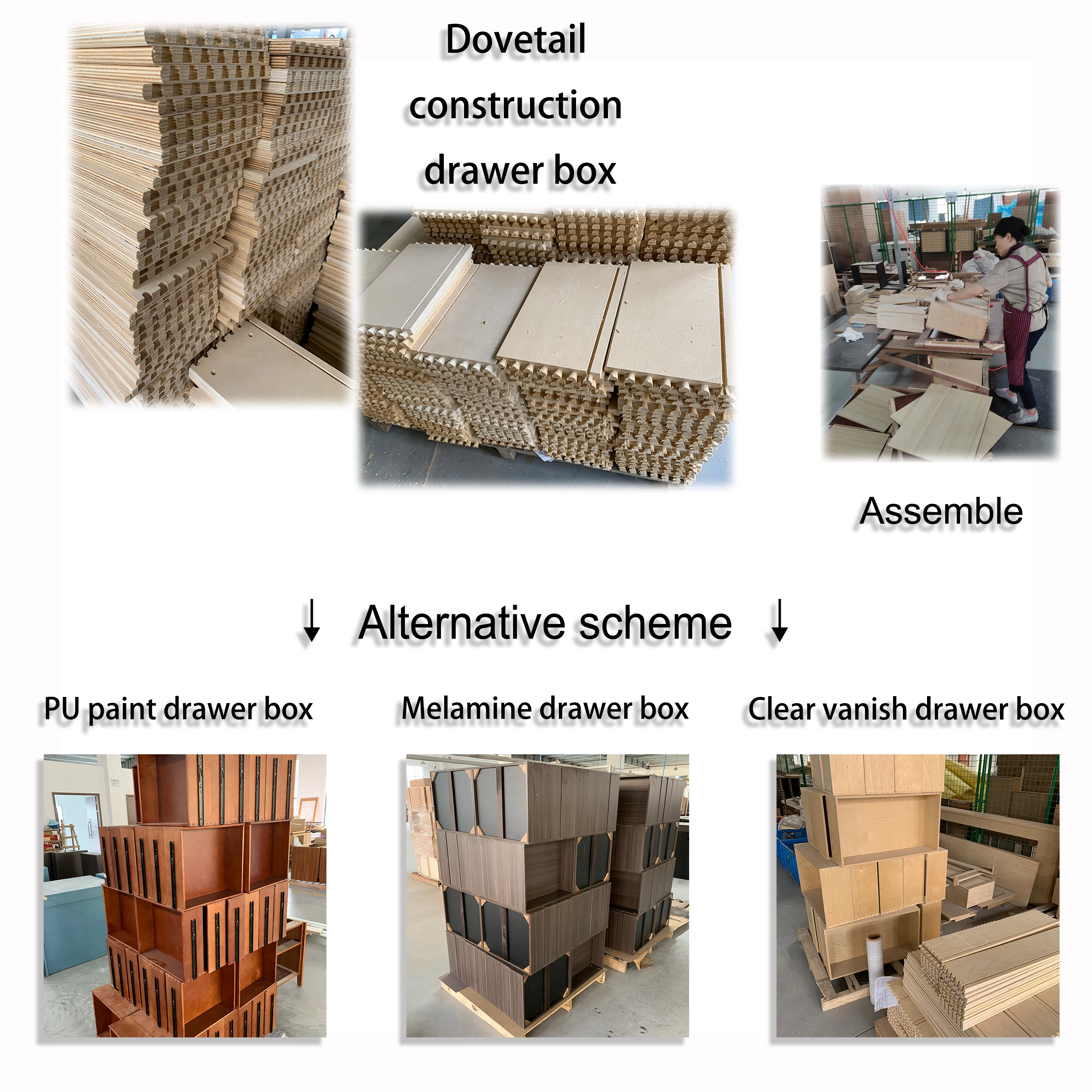 A : The drawers are plywood with French dovetail structure, Drawer front is MDF with Solid wood Veneer covered.