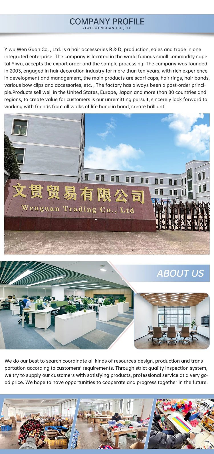 We are based in Zhejiang, China, start from 2019,sell to South America(30.00%),Mid East(20.00%),Southeast Asia(15.00%),North America(15.00%),South Asia(10.00%),Eastern Europe(5.00%),Southern Europe(5.00%). There are total about 51-100 people in our office.