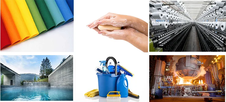 1.Manufacturing of soap 2. Refining petroleum products, 3. Detergent, washing powder, 4. Sanitation, 5. Textiles and paper, 6. Hygiene products, 7. Water softening and treatment, 8. Food industry etc.