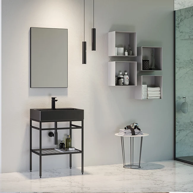 Below, the lower module accentuates modernity with a resplendent glossy white ceramic basin, harmoniously complementing the contemporary design of the unit. Set upon a robust metal body with a sandblasted electrostatic paint finish, this piece showcases unparalleled craftsmanship and durability, boasting dimensions of 80x85 cm with a depth of 46.5 cm. Ensuring ease and efficiency, the unit is equipped with full-extension, soft-close drawers and doors, offering seamless access while maintaining a serene environment.