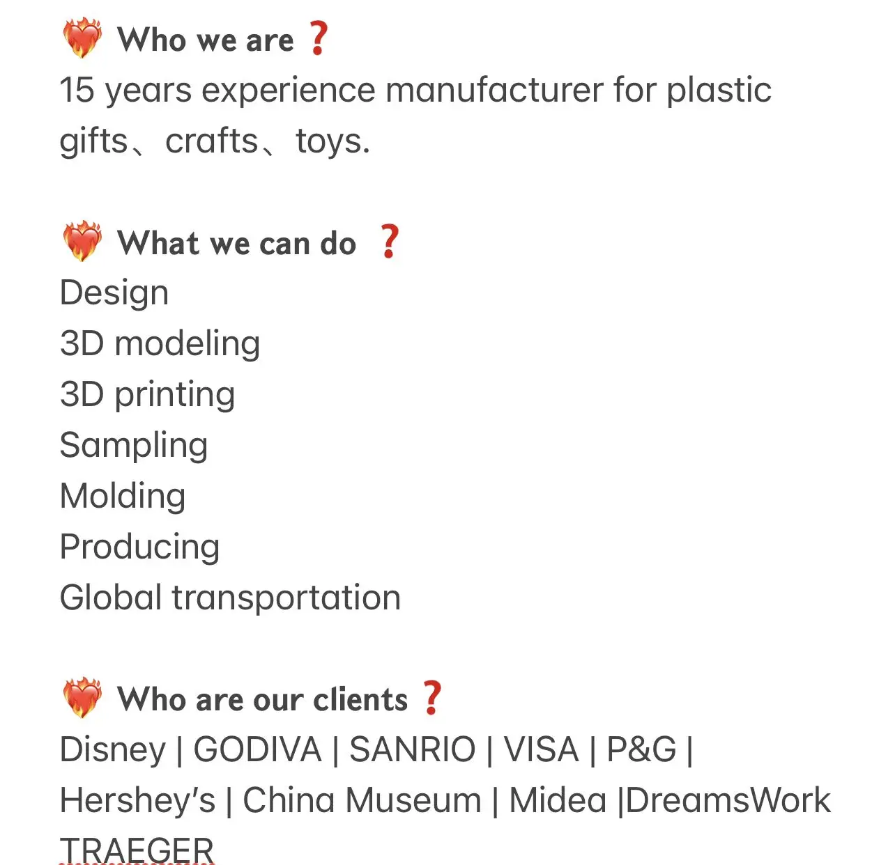 Service | 3D modeling, sampling, molding, manufacturing, global transportation |