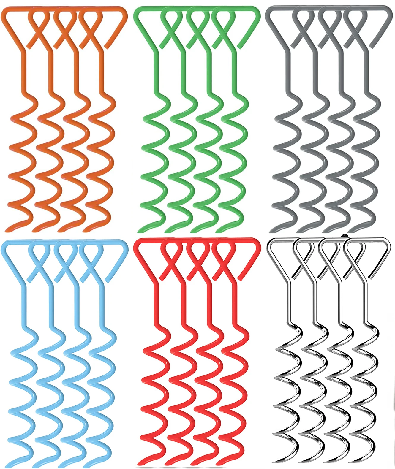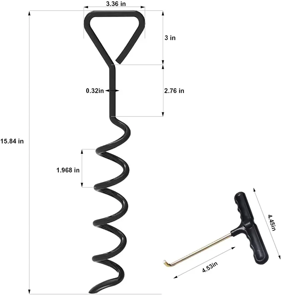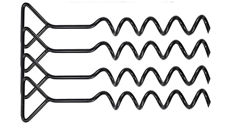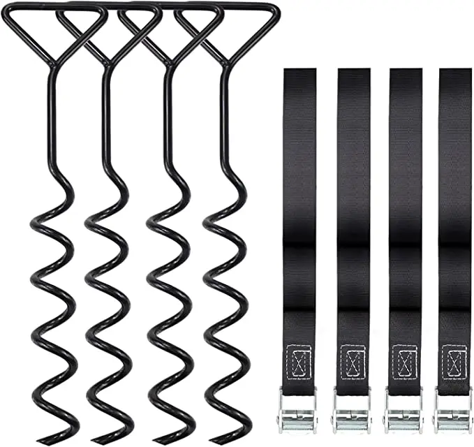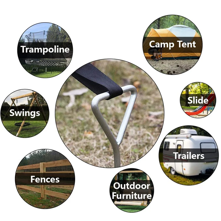 1. 1 PC heavy duty spiral folding ring ground anchors stakes bonus 1 Tie-Downs 2. The spiral ground stakes twist deep into the ground for the highest level of trampoline stability. Spiral design makes anchor relocation and removal easy. Cropped spiral bottom end-tip for easier installation in firm.