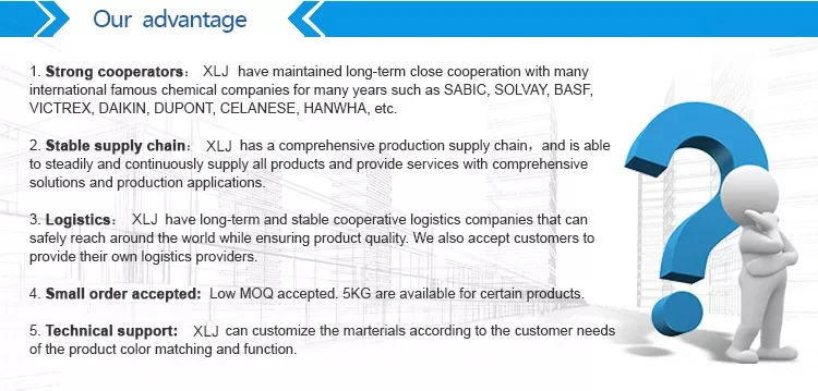 Shanghai XLJ Plastic Industry Co., Ltd is specialized in supplying and exporting plastic raw material for about 10 years. Our main materials are: PA,PBT,POM,PC/ABS,POM.The products are mainly applied to plastic processing industry, such as aerospace, electronics and electrical, medical supplies and equipments, photoelectric communication, water treatment, transports, consumer products and other industries etc.The mainly customers of our company are among the fields of electronics, automobiles, home appliances, daily necessities etc. We are equipped with 5,000 square meters warehouse,has a large inventory and continuously stable supply capacity.As a professional supplier, we can offer you a wide range of materials ,fast quotation and and efficient customer service