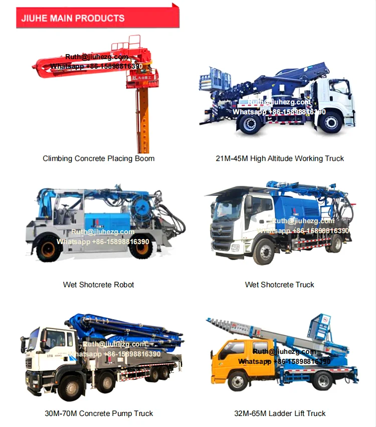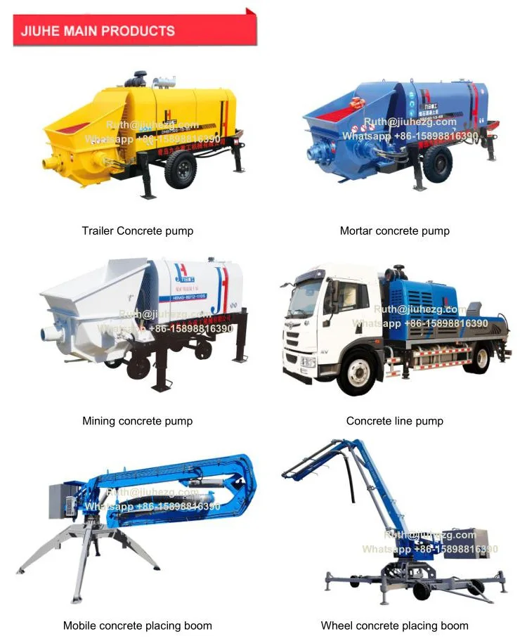 JIUHE is specialized in researching, manufacturing, sale and after sale for construction machinery, main products:trailer concrete pump, concrete line pump, concrete pump truck, concrete placing boom, wet shotcrete machine, ladder lift truck, high altitude working truck and so on.