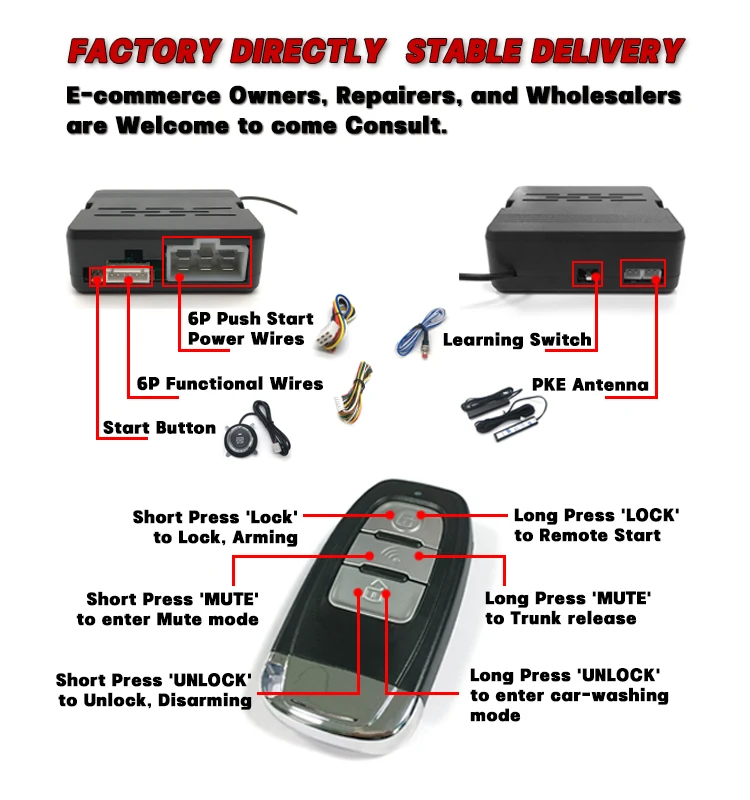 Main Function | 1. Keyless Entry 2. Car Alarm 3. Push Start 4. Remote Engine Start 5. PKE Comfort Entry 6.LCD Smart Key Remote Control 7. With BT Phone APP Control | |