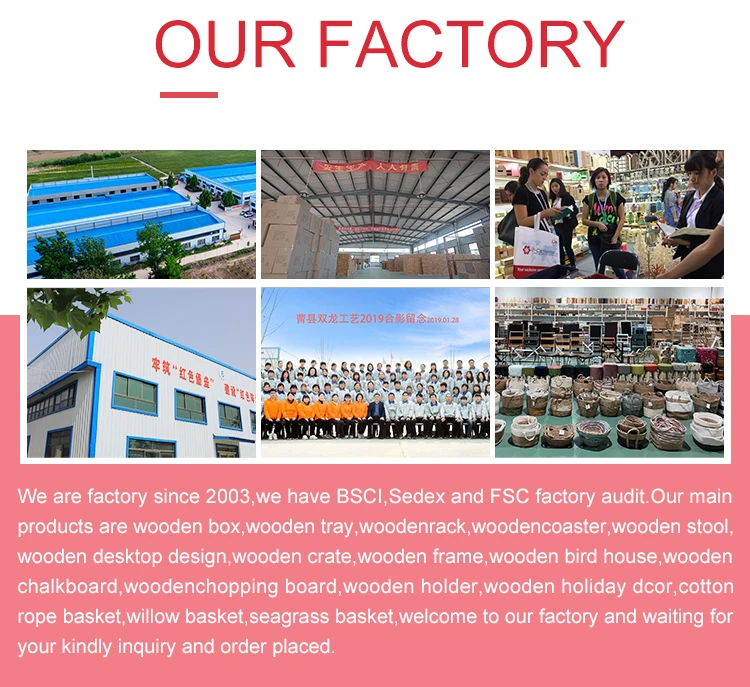 We are factory since 2003,we have BSCI,DISNEY and FSC factory audit.Our main products are wooden box, wooden tray,woodenrack,woodencoaster,wooden stool,wooden desktop design,wooden crate,wooden frame, wooden birdhouse,wooden chalkboard,woodenchopping board,wooden holder,wooden holiday decor,cotton rope basket,willow basket,seagrass basket,ect.,welcome to our factory and waiting for your kindly inquiry and order placed.