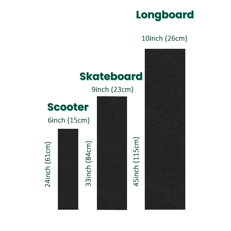 Skateboard grip tape is :33”x9”, longboard grip tape is :47”x10”,Scooter grip tape is :24”x6”. or sizes can be made according to your demands .