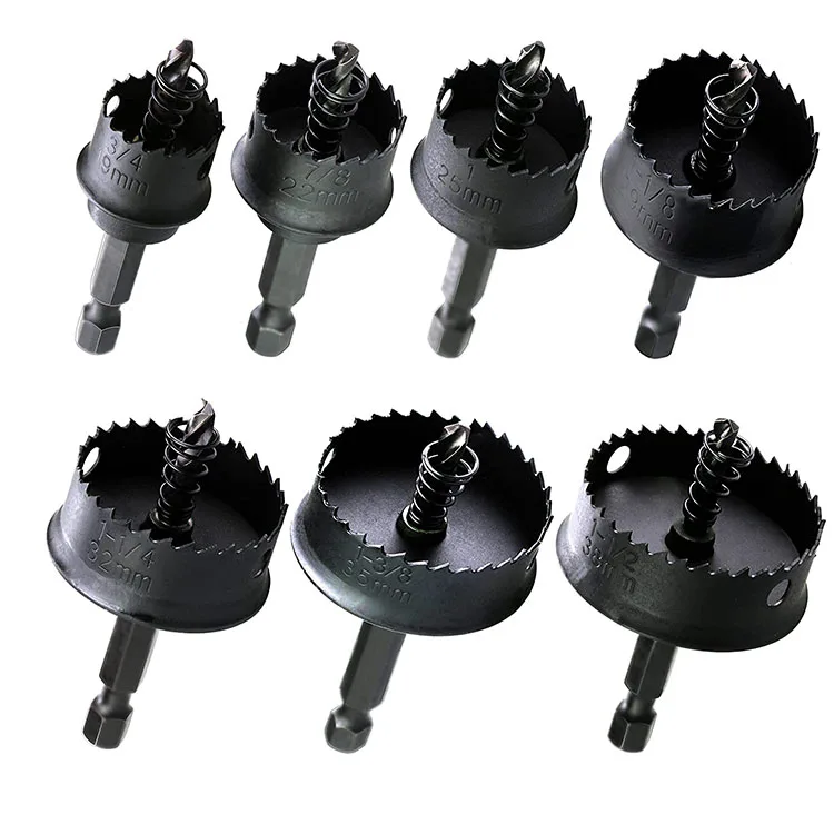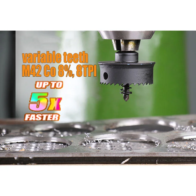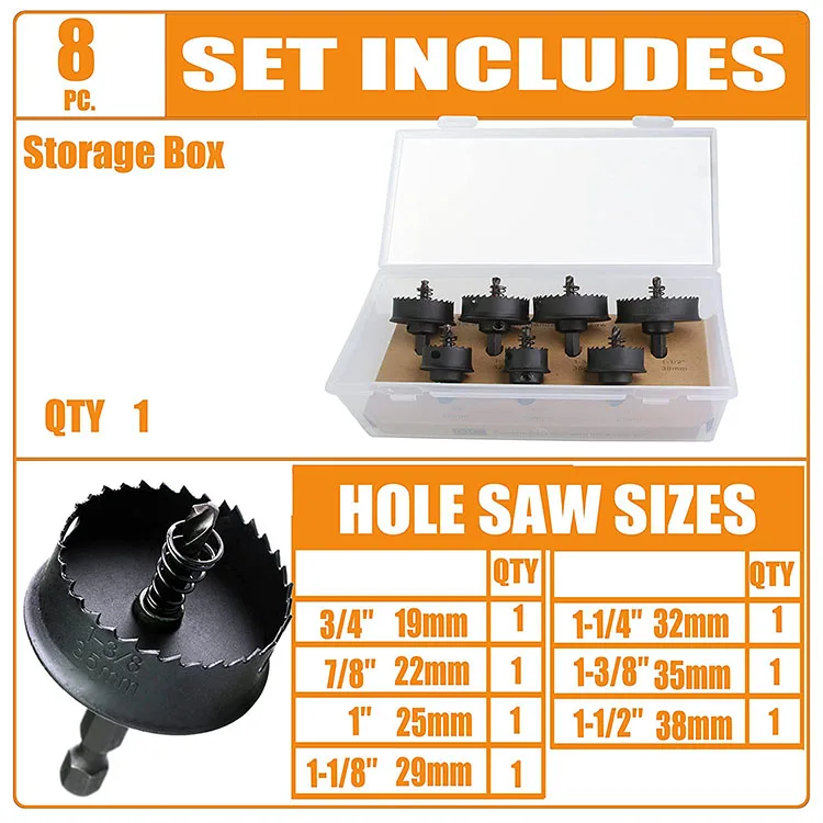 Features | 1, with 1/4” quick change hex shank 2, Ideal for electrical and plumbing tradesman,construction, aircraft, maintenance. Use in Plastic, Sheet Metal, Sheet Stainless Steel. 1/4” Hex shank use for standard drills or High-torque Impact Drivers:Dewalt, Bosch,Milwaukee, Makita etc.brands. Cutting depth: Up to1/8” ((stainless steel less than 0.04” 1mm). Torque : Up to 80 Nm. When you are drilling, low speed ,then, gradually increase the speed 3, The variable teeth are HSS M42, 8% Co,8TPI. It’s for smooth cuts in sheet metal,Clean, long-lasting use. 4, The pilot bit spring is for automatic disk ejection, easy plug removal. The top shoulder design prevents over drilling into material and potentially damaging inner components of the electrical and junction boxes when hole is completed. 5, The hole saw has thin 0.02” sidewall blade thickness for longer battery life. Cuts much faster than standard bi-metal hole saws up to 50%. | ||||||