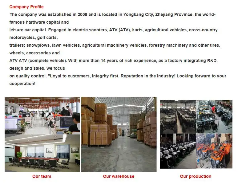 The company was established in 2008 and is located in Yongkang City, Zhejiang Province, the world-famous hardware capital and leisure car capital. Engaged in electric scooters, ATV (ATV), karts, agricultural vehicles, cross-country motorcy