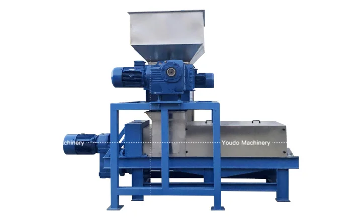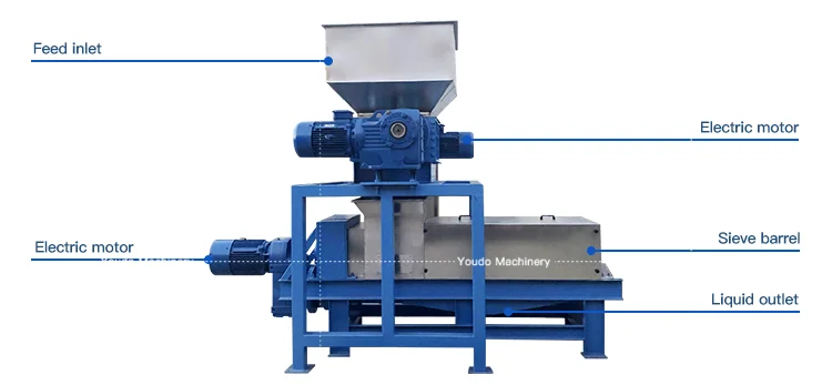 The mobile spiral continuous dewatering machine is made of 304 acid and alkali resistant stainless steel in contact with the material. This machine is composed of a frame, transmission system, feeding section, juice extraction section, hydraulic system and cover, as well as electrical control section. The screw is divided into three parts: feeding screw, pressing screw, and squeezing screw. The material is pressed through the pressing screen cylinder and non stop device, and the material is squeezed through the blocking door and the backlog screen cylinder.