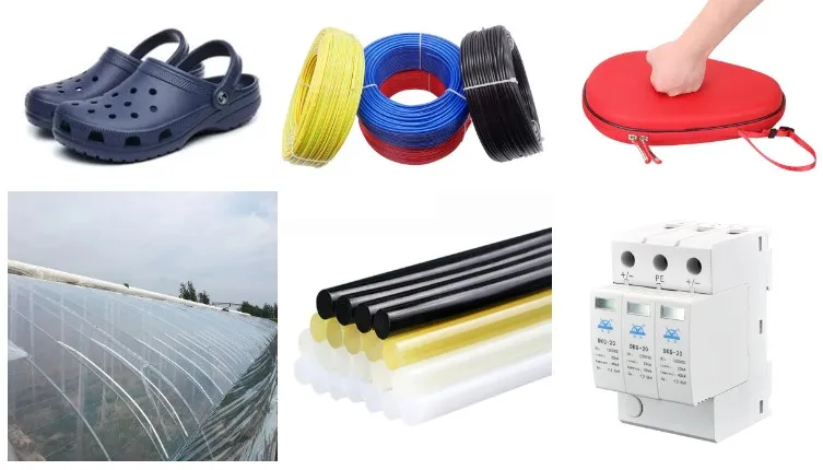 6) EVA with VA content in 5%~45%, the main products are film (including agricultural film) and sheet, injection, molding products, foaming products, hot melt adhesive, etc.
