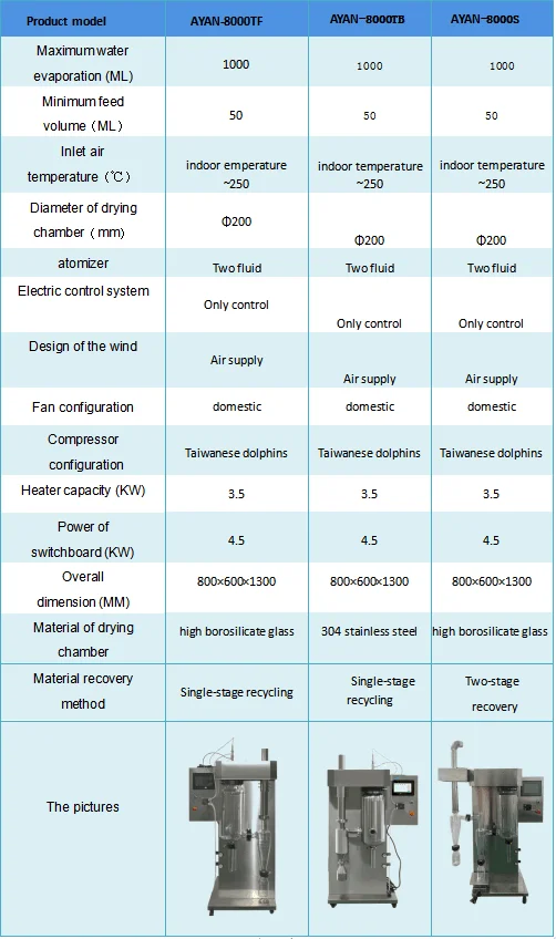 Product name | Small Stainless Steel Spray Drying | Product model | AYAN-8000TB | |||