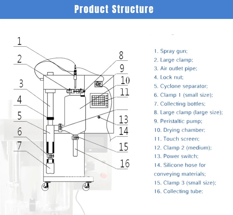 brief description | 1. Atomization chamber, cyclone separator, material collection bottle and waste collection bottle are made of high borosilicate glass. 2. The chassis adopts SUS304. 3. Bag device (optional) : improve recovery rate. The water evaporation and heater power shall be based on the inlet air temperature of 250℃. Note: External dimensions are reference dimensions and can be adjusted according to the site. | |||||